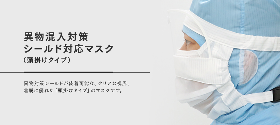 異物混入対策シールドが装着可能な、クリアな視界、着脱性に優れた「頭掛けタイプ」のマスク