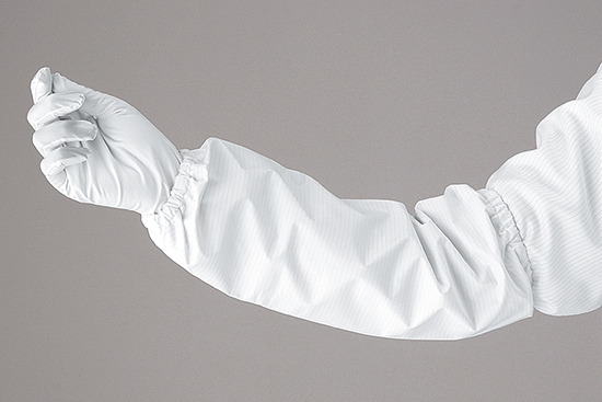 肘から手首を包み込む耐薬品アームカバー。上下口ゴム仕様でホールドします。