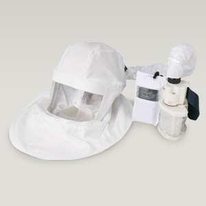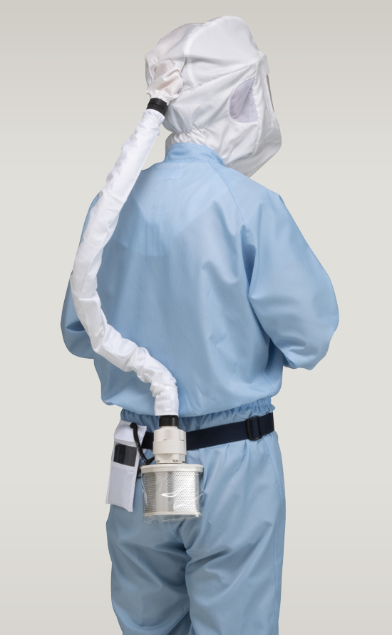 クリーンルーム用フードの前面開口部に透明な樹脂レンズを装着し、モーターファンでフード内部を陰圧にすることで頭部からの発塵を抑制します。