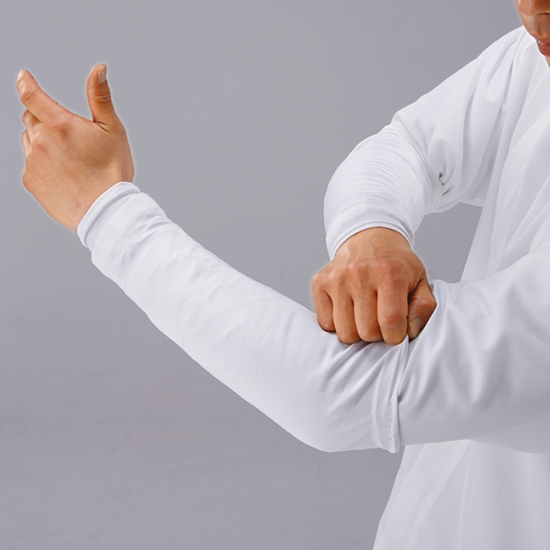 ストレッチ素材を用いたアームカバーで、袖口の膨らみを抑え、作業性を向上します。