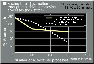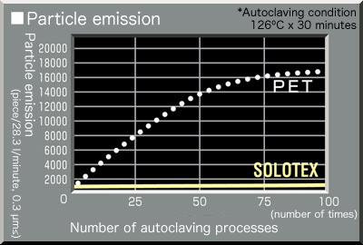 Unlike conventional autoclavable material (polyester fiber) whose particle emissions increased rapidly, Solotex does not emit significantly increased amounts of particles even after repetitive autoclave sterilization processes. The material sustains its dust prevention function.