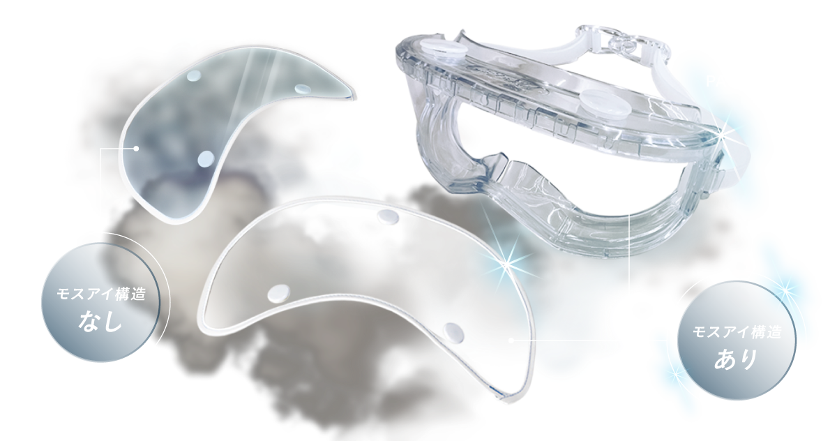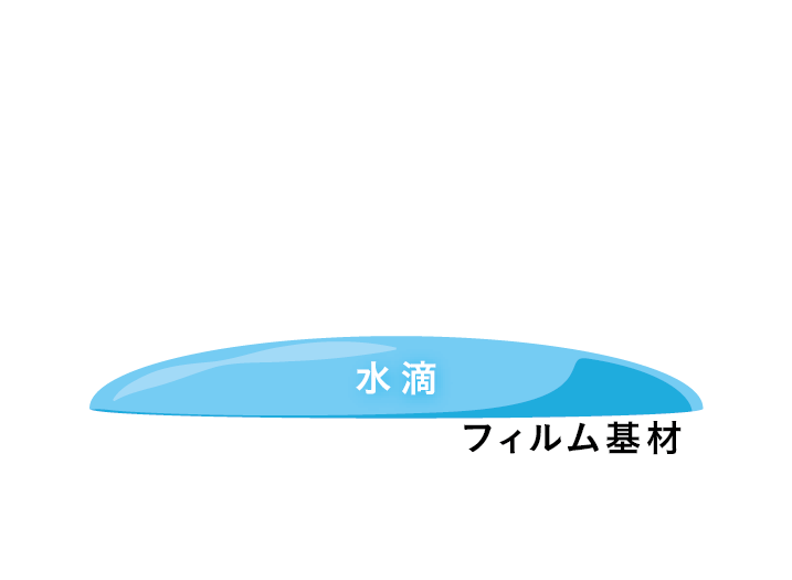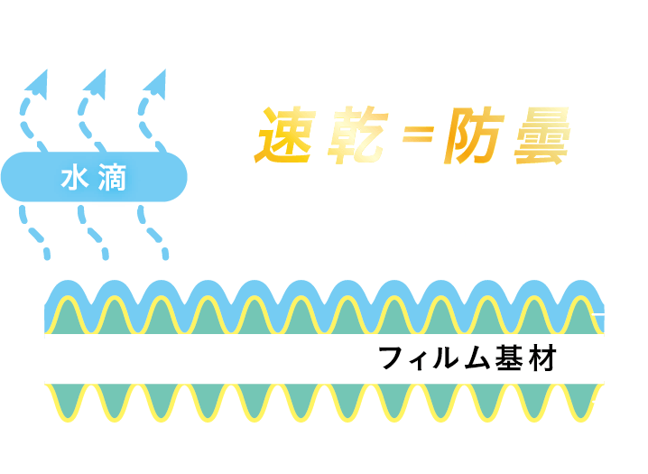 特殊なアクリル系樹脂とモスアイ構造の組み合わせで、フィルム表面に付着した水滴の表面積を素早く広げることで、高湿環境下やシールドを装着した際の呼気による曇りを軽減します。